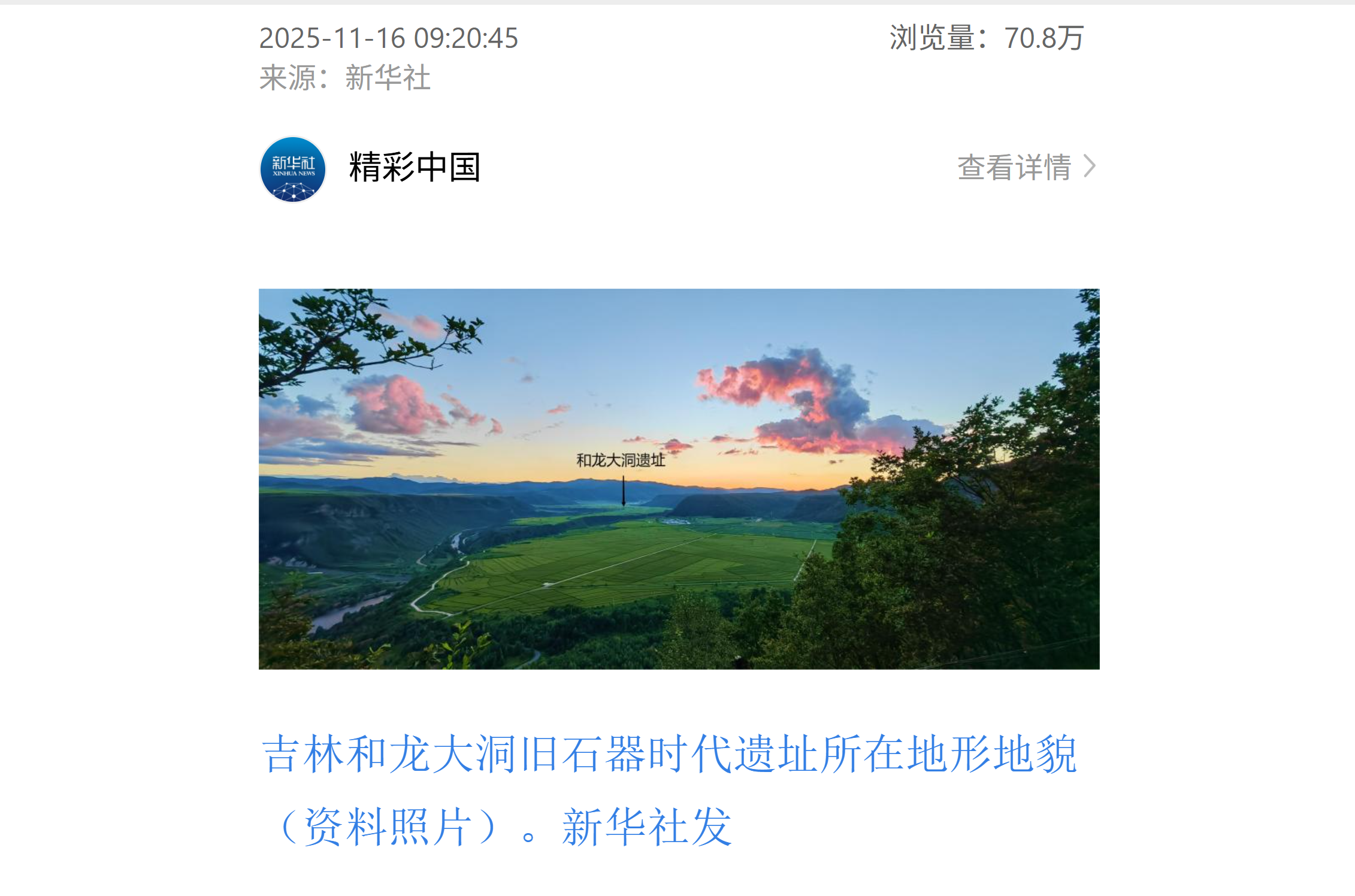 11月16日,新华社报道历史学部考古文博学院徐廷教授与合作者关于东北亚旧石器时代考古的新成果,一项基于吉林和龙大洞遗址的考古研究成果挑战了东北亚地区旧石器时代“细石器技术自南向北扩散”的传统假设。该成果于11月8日发表在国际地学领域权威学术期刊《第四纪科学评论》上。截至目前该报道得到中国网、中国科技网等58家媒体采用,客户端浏览量115万。吉林和龙市大洞旧石器时代遗址考古发掘是“考古中国——吉林东部长白...